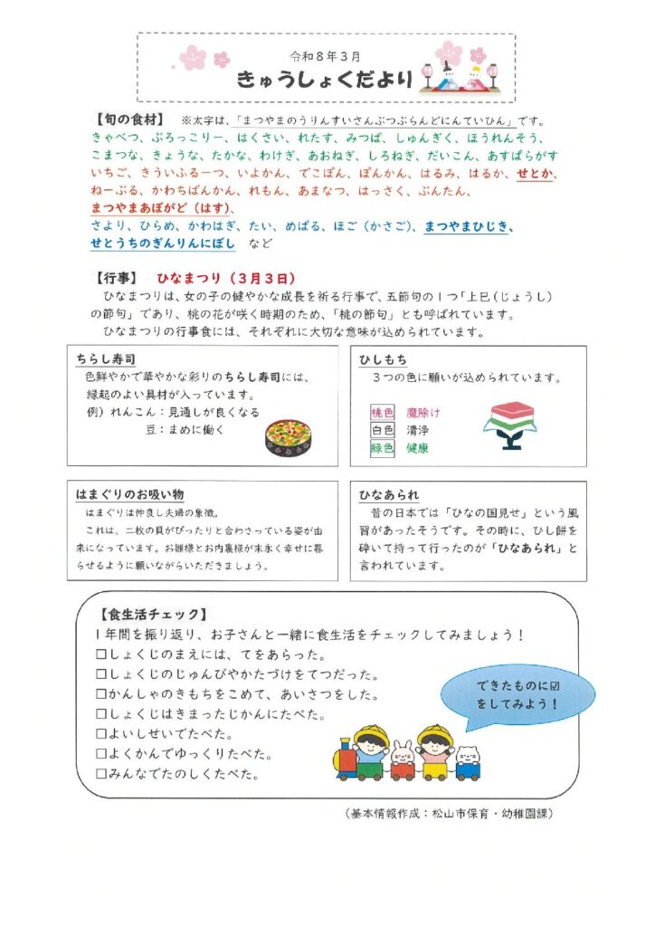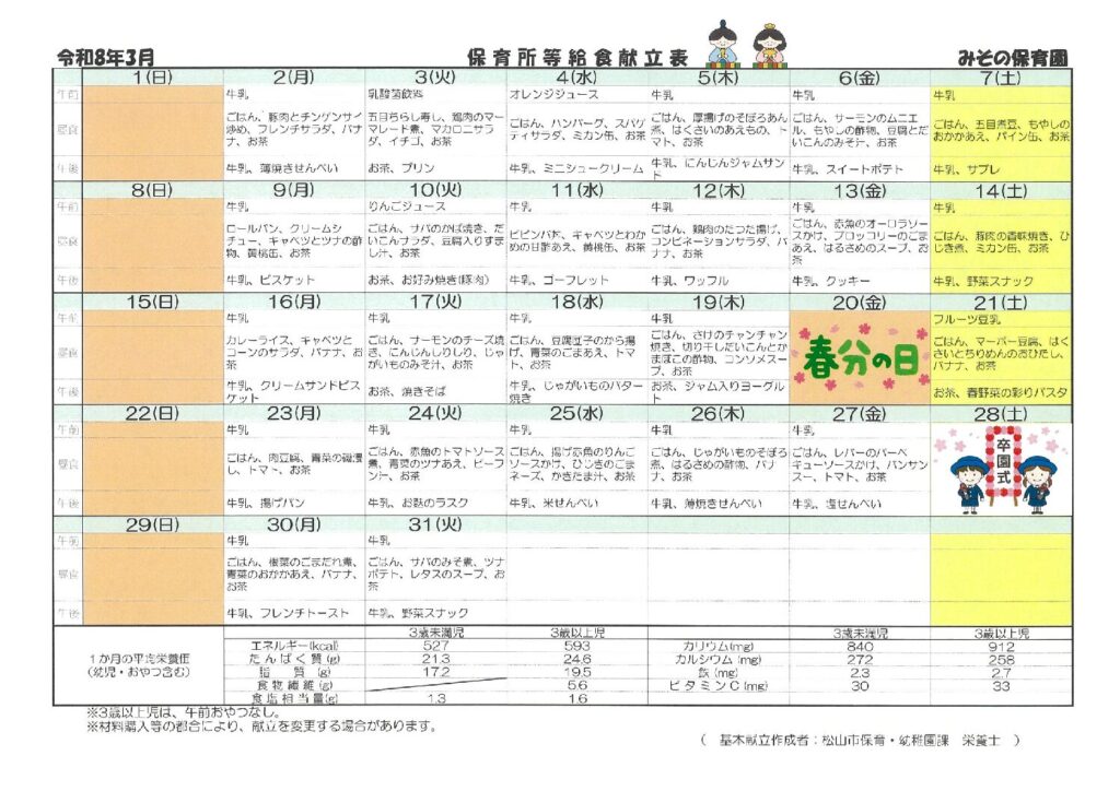 中の川🌸献立表 2026 2/25 中の川園 献立 2026年2月25日 きゅうしょくだより 中の川園 献立 中の川🌸3月園だより 今年度の自己評価結果を公表致します 関連記事 中の川🌸3月園だより 2026年2月25日 中の川🌟給食アンケート結果 2026年1月26日 中の川🍚2月献立表 2026年1月26日 中の川👹2月園だより 2026年1月26日 中の川🎍🐎1月園だより 2026年1月5日 ほけんだより 2025年12月25日 中の川🍚1月献立 2025年12月25日 お堀の図書館 2025年12月4日