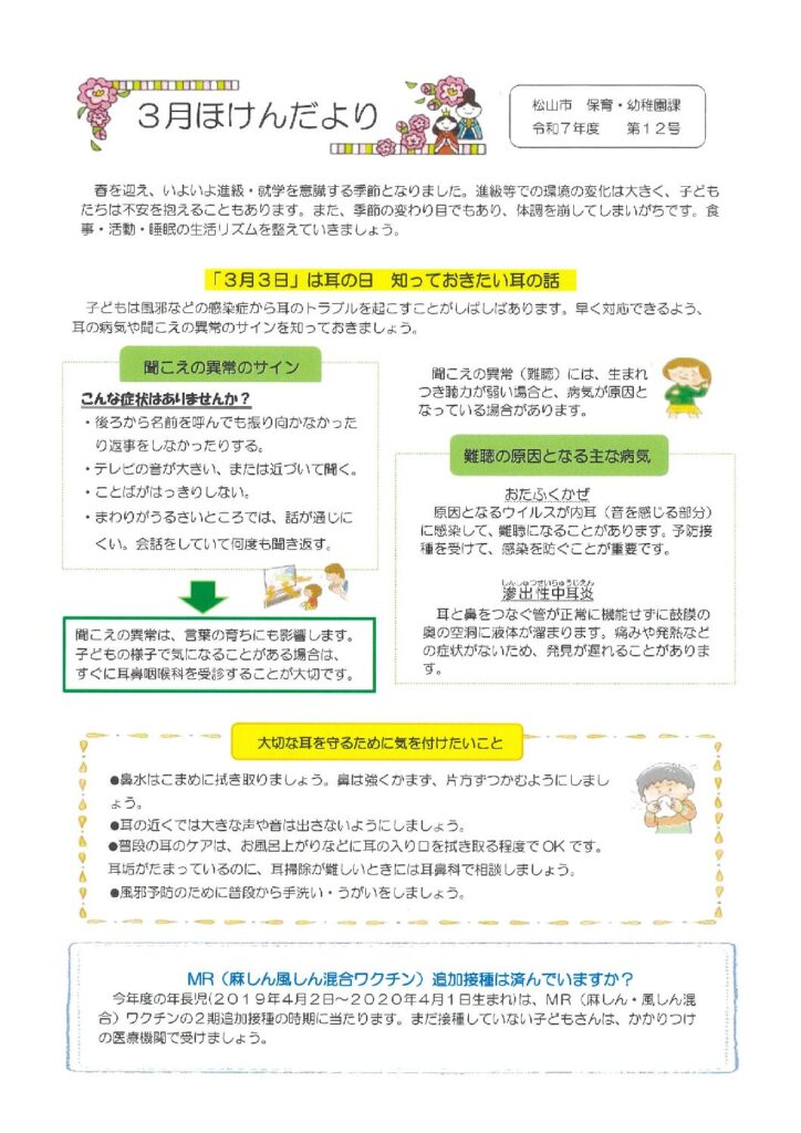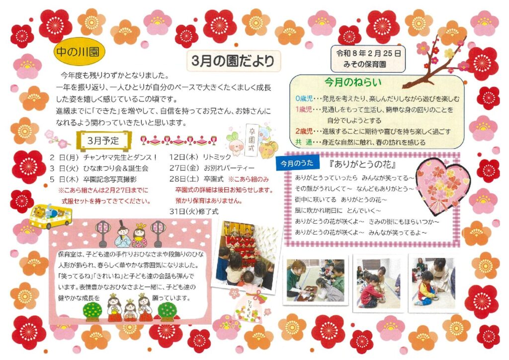 中の川🌸3月園だより 2026 2/25 中の川園 保護者へのお知らせ 園だより 2026年2月25日 ほけんだより 中の川園 保護者へのお知らせ 園だより 余戸園🎎3月献立表 中の川🌸献立表 関連記事 中の川🌸献立表 2026年2月25日 中の川🌟給食アンケート結果 2026年1月26日 中の川🍚2月献立表 2026年1月26日 中の川👹2月園だより 2026年1月26日 中の川🎍🐎1月園だより 2026年1月5日 ほけんだより 2025年12月25日 中の川🍚1月献立 2025年12月25日 お堀の図書館 2025年12月4日