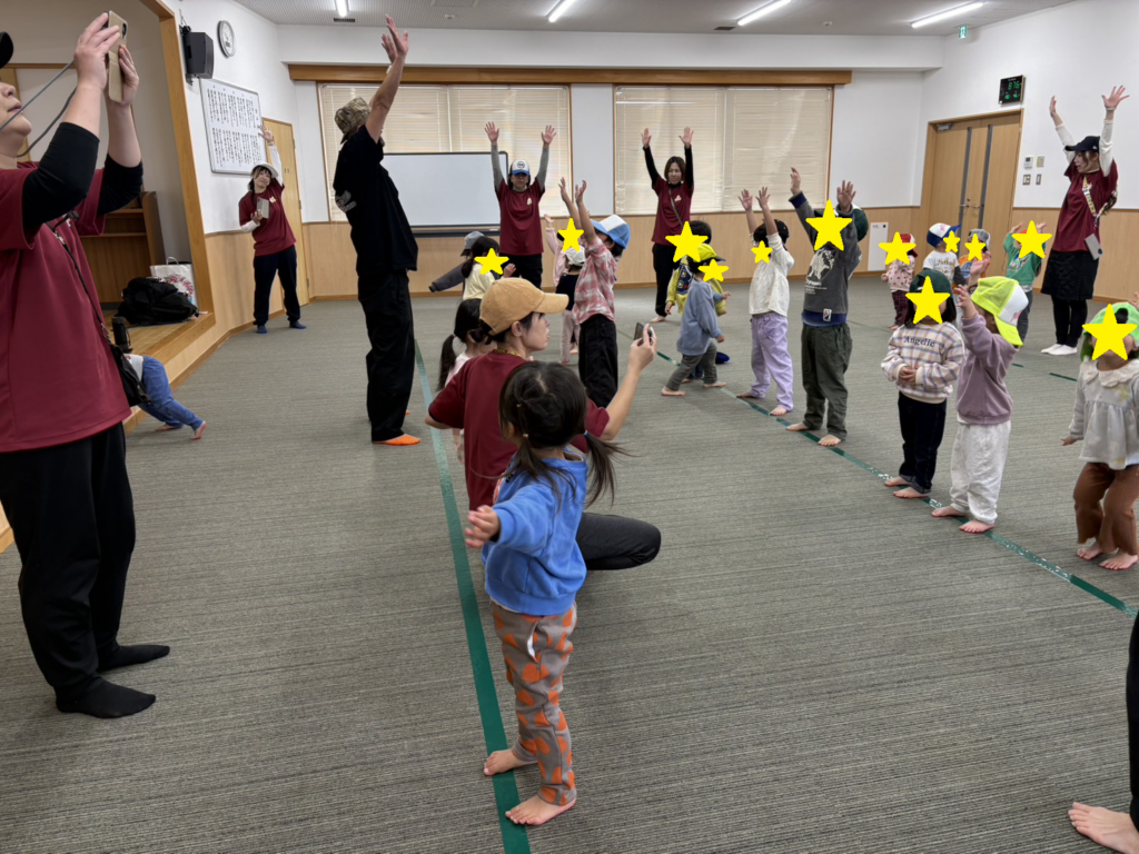 連携園の保育園のお友だちと一緒にチャンヤマ先生のダンスに参加しました(*^^*)🎵 まずは、ダンスの前に準備運動~🎵🎵 体をしっかりのばして、これからのダンスに準備万端✌✌ チャンヤマ先生に早速教えて頂きます(*^^*)🎵 線の上をいろんなジャンプをした... -
