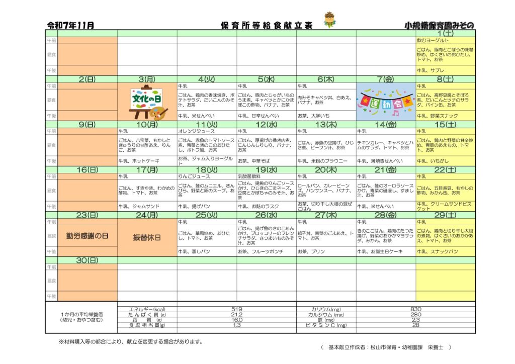 余戸園🍂11月給食献立表&給食だより