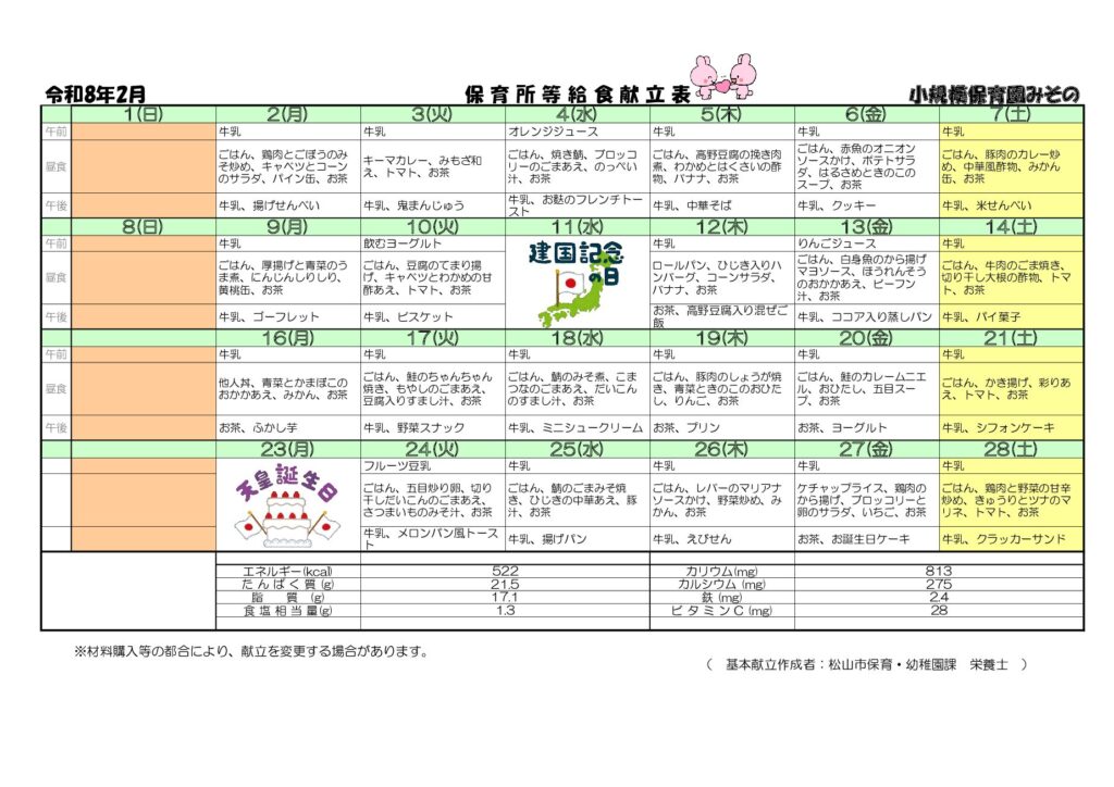 余戸園💝2月給食献立表