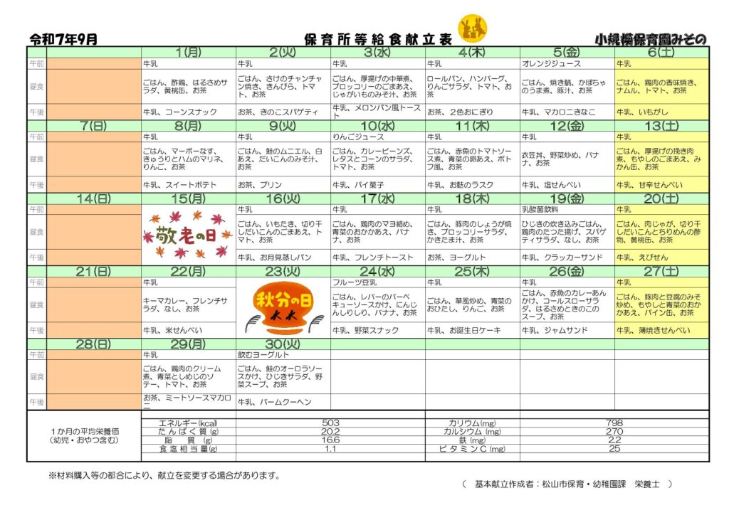 余戸園🍇9月給食献立表&給食だより